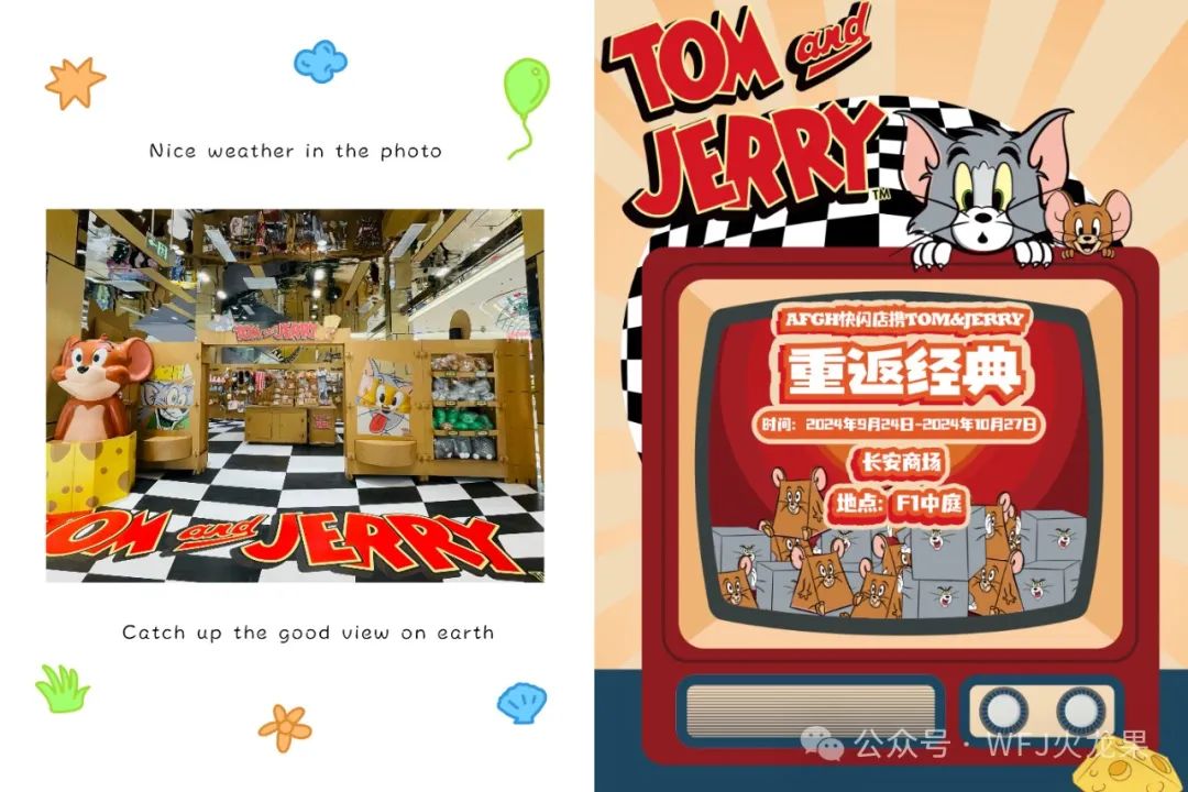 9月24,长安阛阓联手AFGH异业资源,在一层中庭打造“TOM & JERRY”首届社区店,开启经典复古意见意义空间,向导主顾回归经典,邂逅童年超萌趣CP。同时,通过打造奇异的艺术创意提升营销热度,吸引主顾进店消耗。
